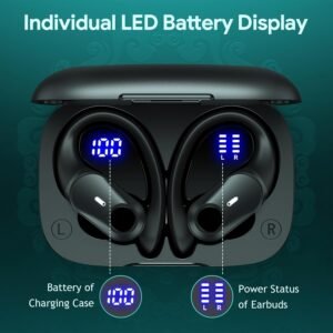 Wireless & Type-C Fast Charging: Bluetooth earbuds support wireless charging for ultimate convenience and Type-C for faster power-ups. One is just putting the case on the wireless charging pad (not included) with the LED display facing up. Besides, wireless earbuds with earhooks come equipped with Type-C cable to charge the case. A quick 15-minute charge provides 1 hour of playtime, ensuring your music never stops. The LED display flashes during charging, keeping you updated at all times.
