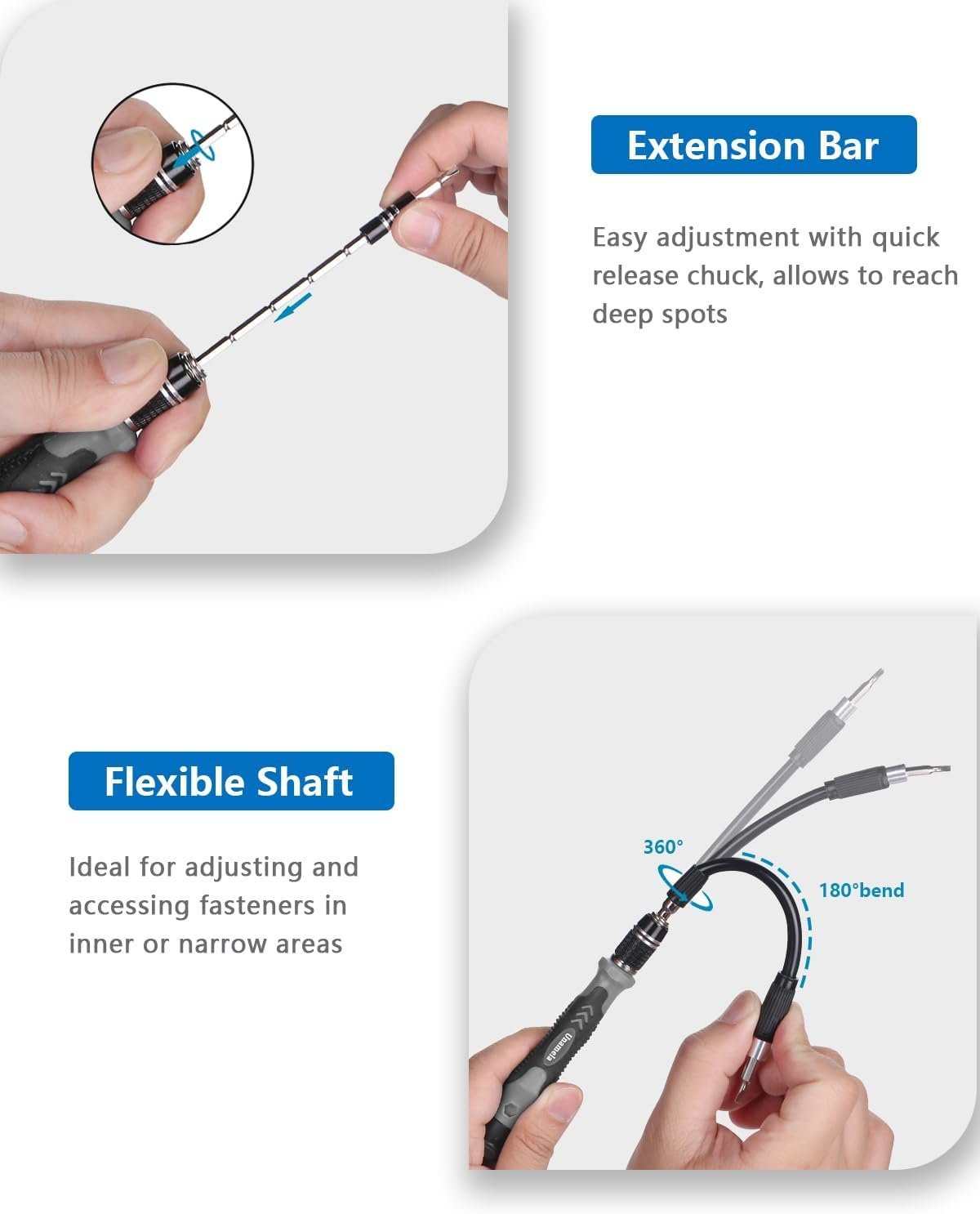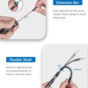 Practical Repair Tool: This electronic screwdriver set is professionally designed to maximize your repair ability. The screwdriver handle is ergonomically designed, with non-slip particles outside, easy to exert force and rotate smoothly; the 4.56 inch alloy steel extension rod has high hardness, not easy to bend, suitable for narrow gaps; 5.11 inch flexible shaft is composed of CRV springs , which can be bent 180° and rotated 360°, helping you easily deal with complex disassembly environments.